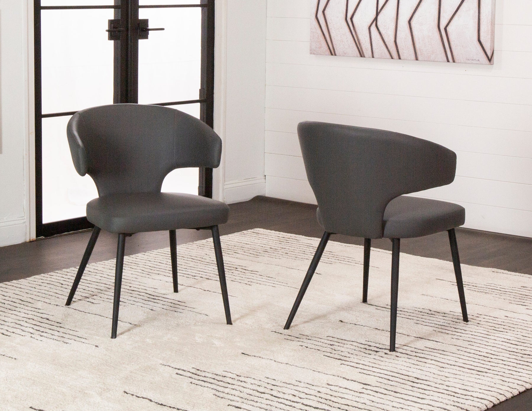 Add a touch of unique curvature to your square, rectangular, round, or oval dining table with these sleek modern dining room chairs. Crafted with a durable frame and upholstered in high-quality charcoal gray faux leather, it combines timeless elegance with long-lasting durability. The matte black powder-coated metal legs provide excellent stability, ensuring a sturdy and reliable seating option. Designed for versatility, this chair is a perfect addition to modern dining rooms and serves as stylish extra seating throughout your home. Its chic, minimalist aesthetic seamlessly complements any décor. Compact yet spacious, it fits effortlessly into smaller spaces like dorm rooms, apartments, home offices, or bedroom vanities, while still offering ample seating for larger dining rooms, kitchens, and office waiting areas. This upholstered chair with wrap-around arms is designed to promote excellent posture and provide lasting support for hours of comfort. A blend of mid-century modern style and functional design, this chair is a standout piece that enhances both aesthetics and comfort in any setting. Elevate your dining experience with this stylish and practical side chair.