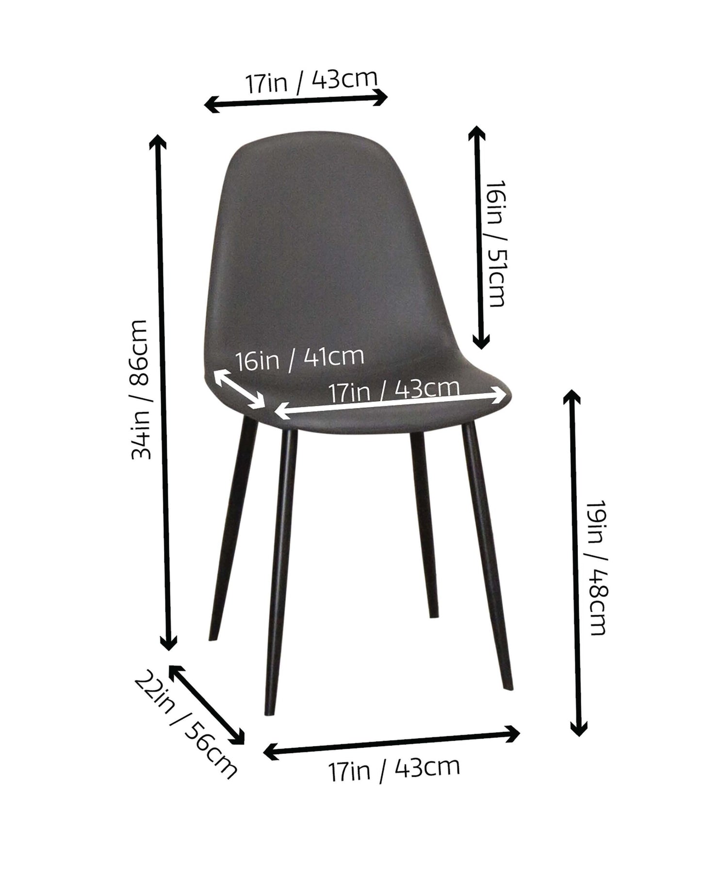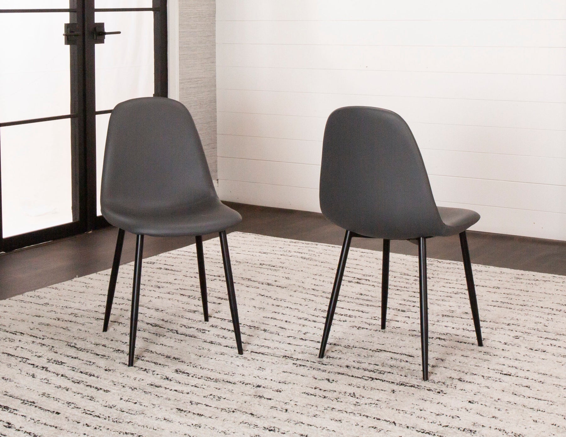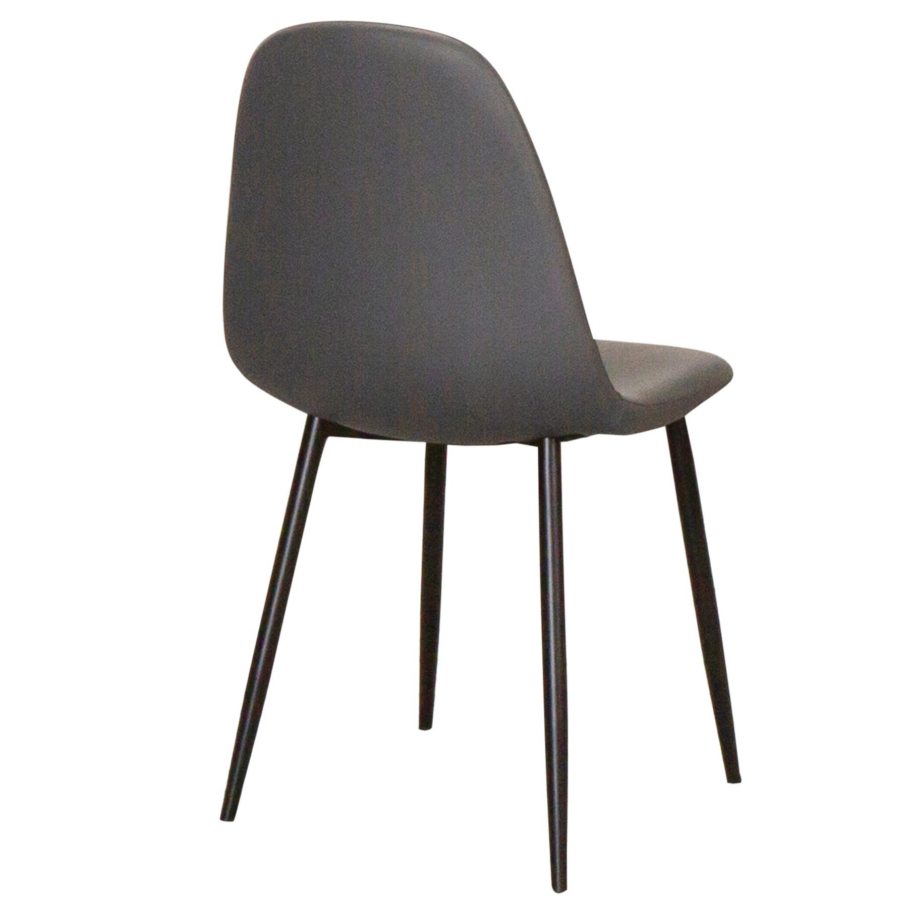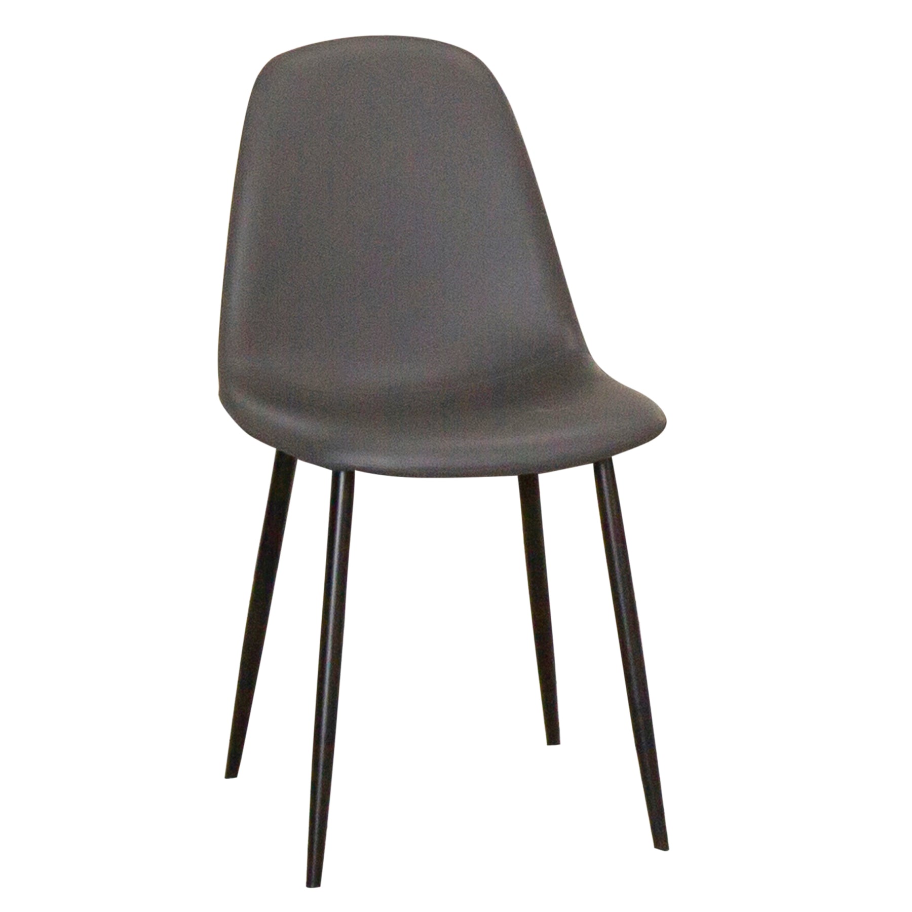 Blending Scandinavian minimalism with mid-century modern charm, this sleek dining chair offers both style and comfort. Its angular, tapered black metal legs add a touch of Art Deco sophistication, seamlessly elevating any space. Crafted with a durable frame and upholstered in high-quality rich charcoal gray faux leather, it delivers timeless elegance and long-lasting durability. Designed for versatility, this chair is a perfect addition to modern dining rooms and functions as stylish extra seating throughout your home. The matte black powder-coated metal legs ensure exceptional stability, making it a sturdy and reliable choice. Compact yet spacious, it fits effortlessly into smaller spaces like dorm rooms, apartments, home offices, and bedroom vanities, while still offering ample seating for larger dining areas, kitchens, office conference and waiting rooms. The high cushioned back is ergonomically designed to promote excellent posture and provide lasting support for hours of comfort. With its simple yet functional design, this sturdy side chair brings an airy, contemporary feel to any setting. Elevate your dining experience with this stylish and practical chair today!