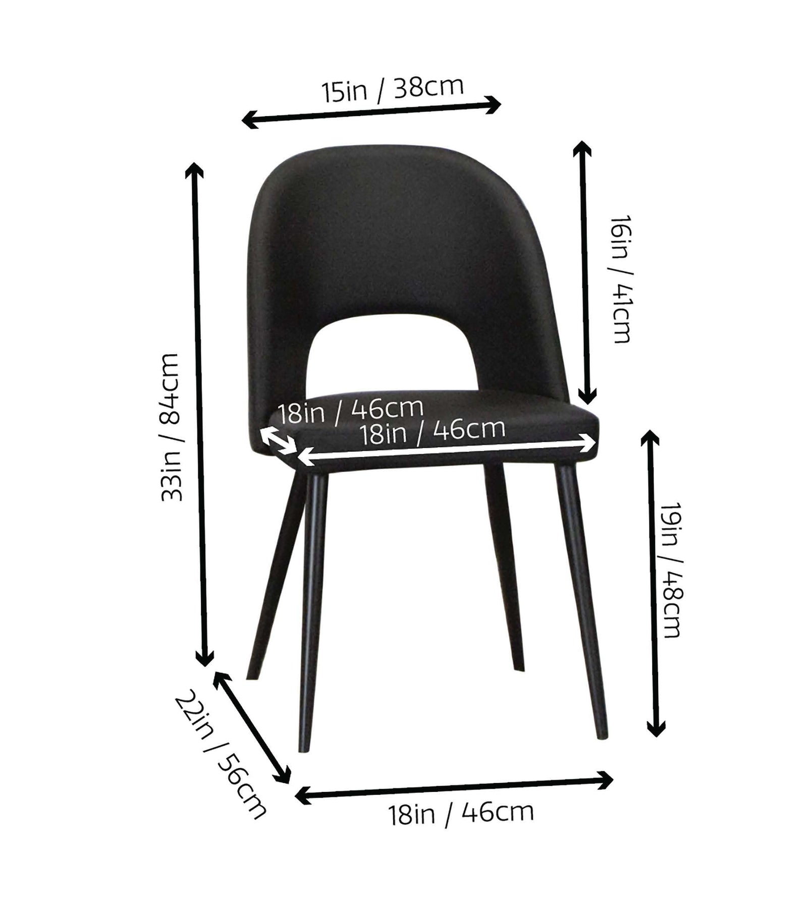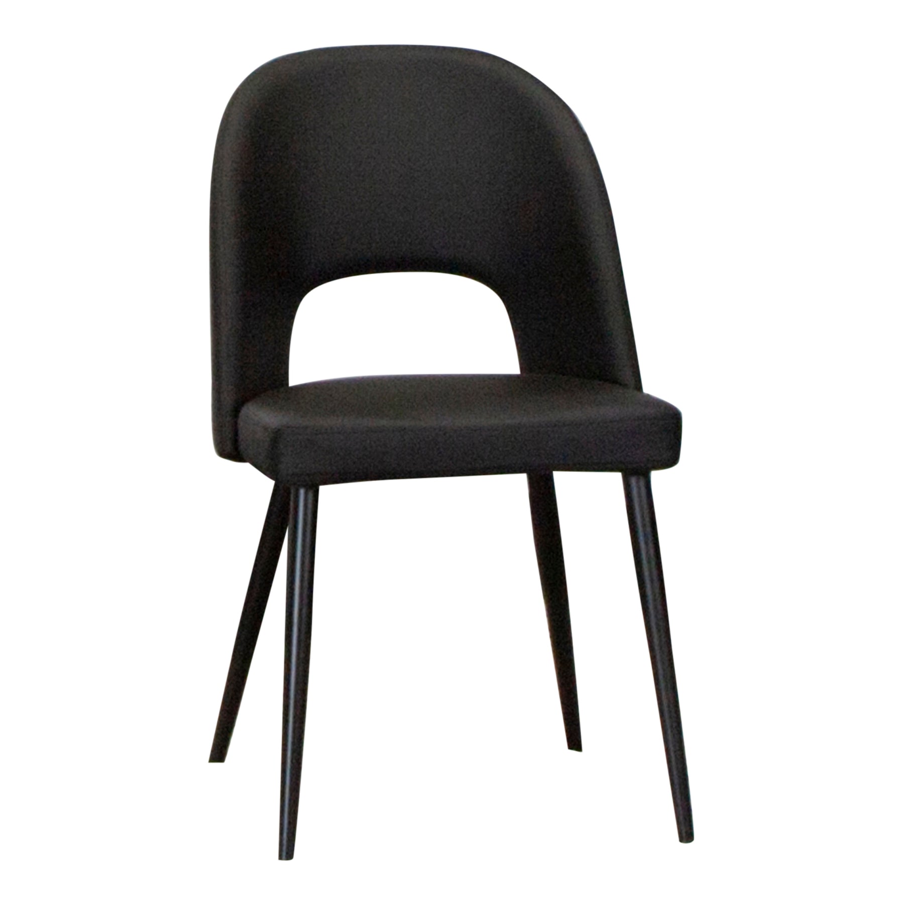 Blending Scandinavian minimalism with mid-century modern charm, this sleek dining chair offers both style and comfort. Splayed, powder-coated metal legs add a touch of Art Deco sophistication, seamlessly elevating any space. Crafted with a durable frame and upholstered in high-quality rich black faux leather, it delivers timeless elegance and long-lasting durability. Designed for versatility, this chair is a perfect addition to modern dining rooms and functions as stylish extra seating throughout your home. Tapered metal legs ensure exceptional stability, making it a sturdy and reliable choice. Compact yet spacious, it fits effortlessly into smaller spaces like dorm rooms, apartments, home offices, and bedroom vanities, while still offering ample seating for larger dining areas, kitchens, office conference and waiting rooms. The high cushioned open back is ergonomically designed to promote excellent posture and provide lasting support for hours of comfort. With its simple yet functional design, this sturdy side chair brings an airy, contemporary feel to any setting. Elevate your dining experience with this stylish and practical chair today!