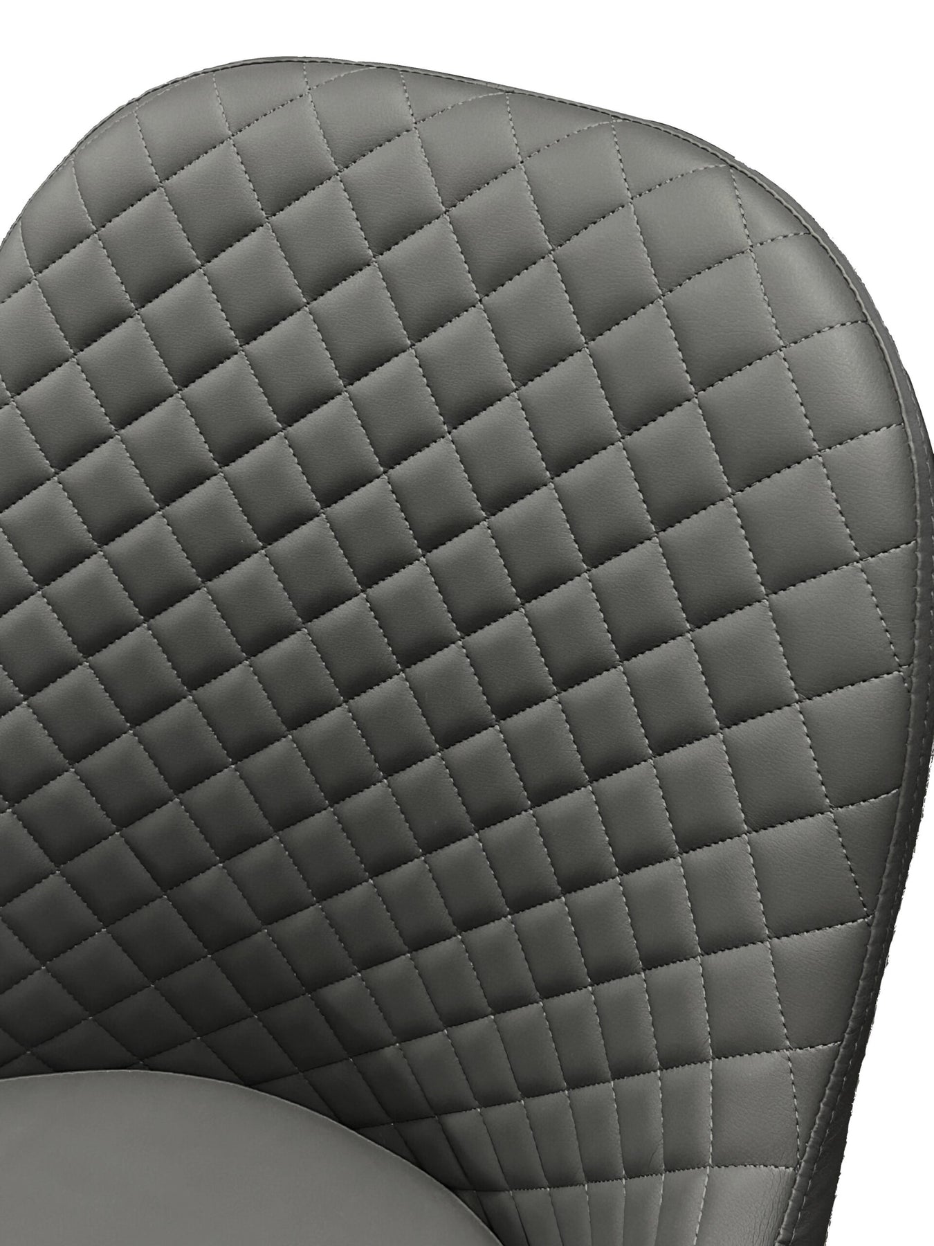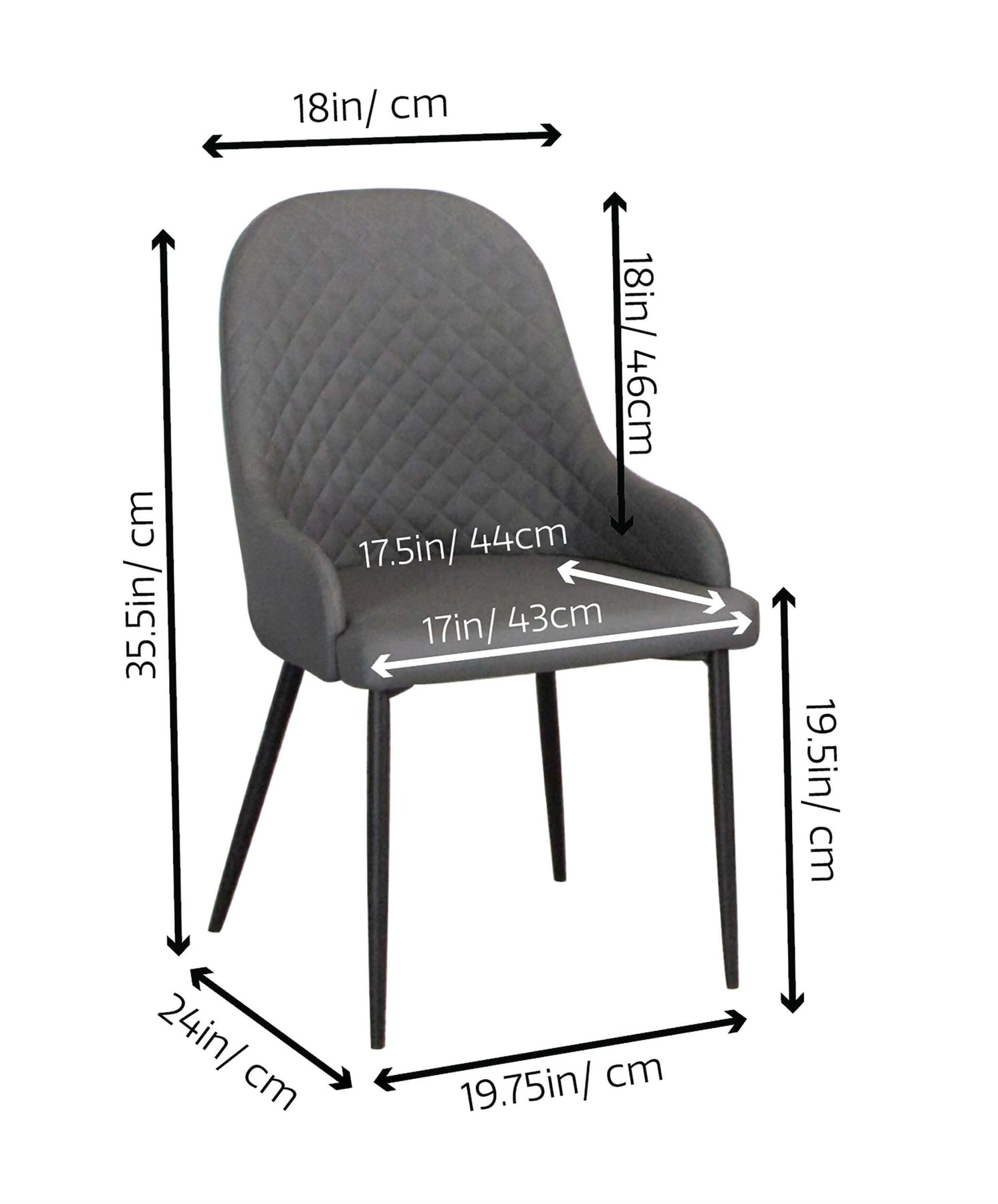 Blending Scandinavian minimalism with mid-century modern charm, these sleek dining room arm chairs offer both style and comfort. Splayed, powder-coated black metal legs add a touch of Art Deco sophistication, seamlessly elevating any space. Crafted with a durable frame and upholstered in high-quality charcoal grey faux leather, it delivers timeless elegance and long-lasting durability. Designed for versatility, this chair is a perfect addition to modern dining rooms and functions as stylish extra seating throughout your home. Tapered metal legs ensure exceptional stability, making it a sturdy and reliable choice. Compact yet spacious, it fits effortlessly into smaller spaces like dorm rooms, apartments, home offices, and bedroom vanities, while still offering ample seating for larger dining areas, kitchens, office conference and waiting rooms. The high cushioned back with low curved arms is ergonomically designed to promote excellent posture and provide lasting support for hours of comfort. With its simple yet functional design, this sturdy side chair brings an airy, contemporary feel to any setting. Elevate your dining experience with this stylish and practical chair today!